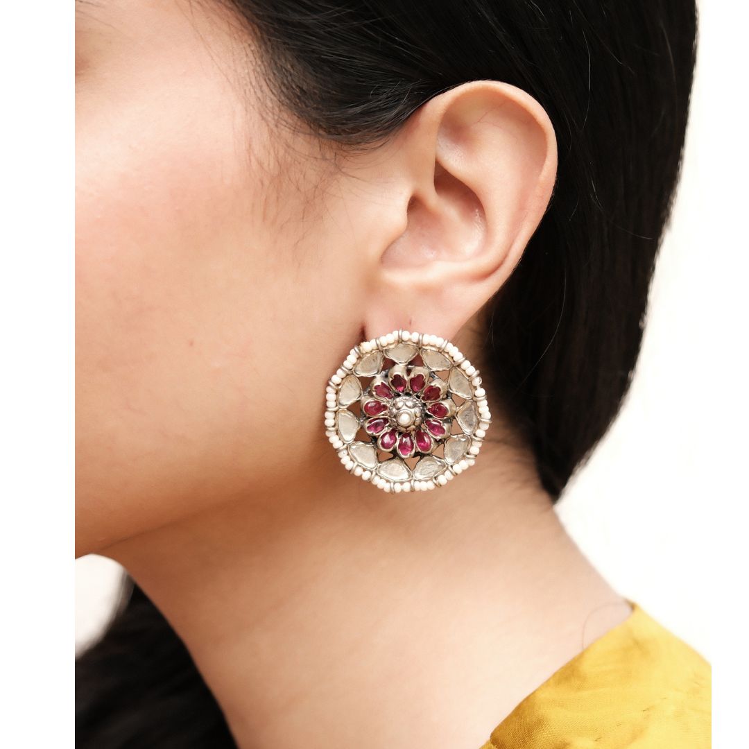 Gul Stud Earrings are handcrafted in 92.5 silver with glass stones, faux kundan and pearls. These stud earrings are statement and classic.