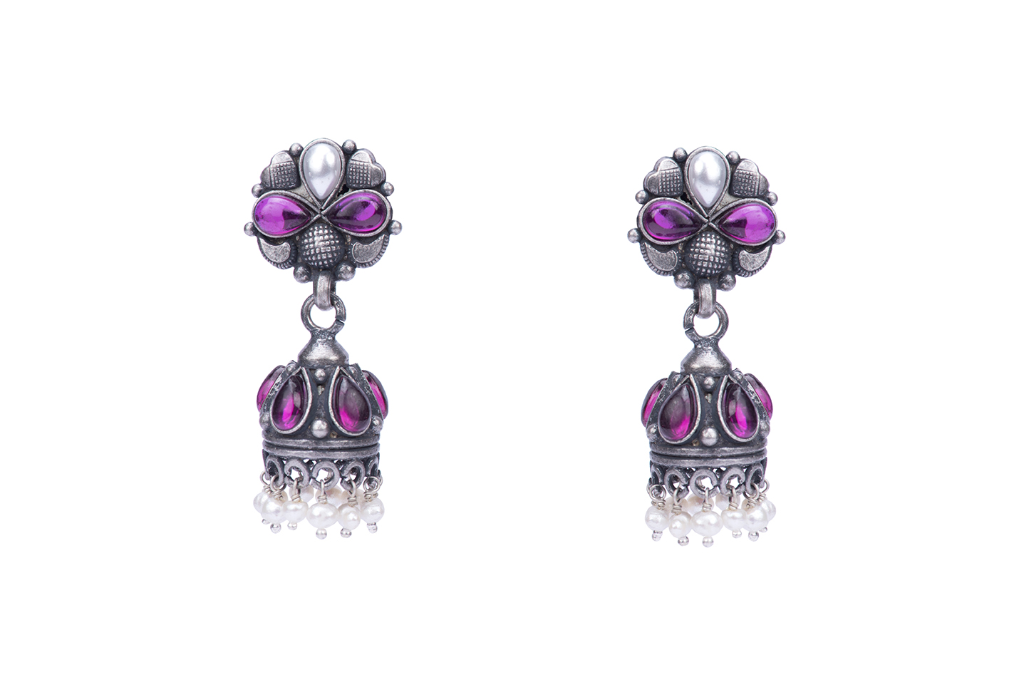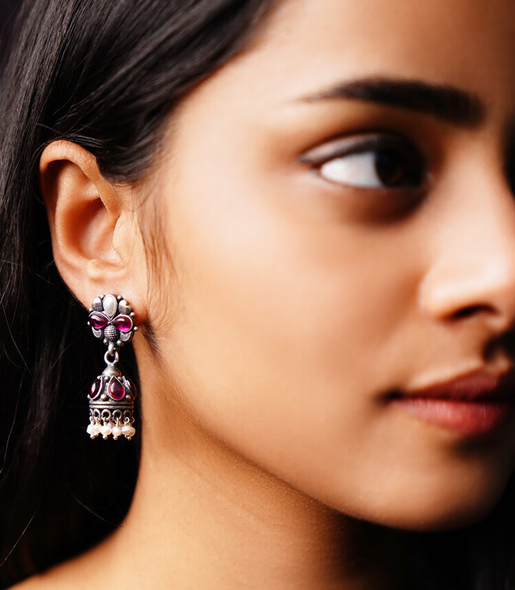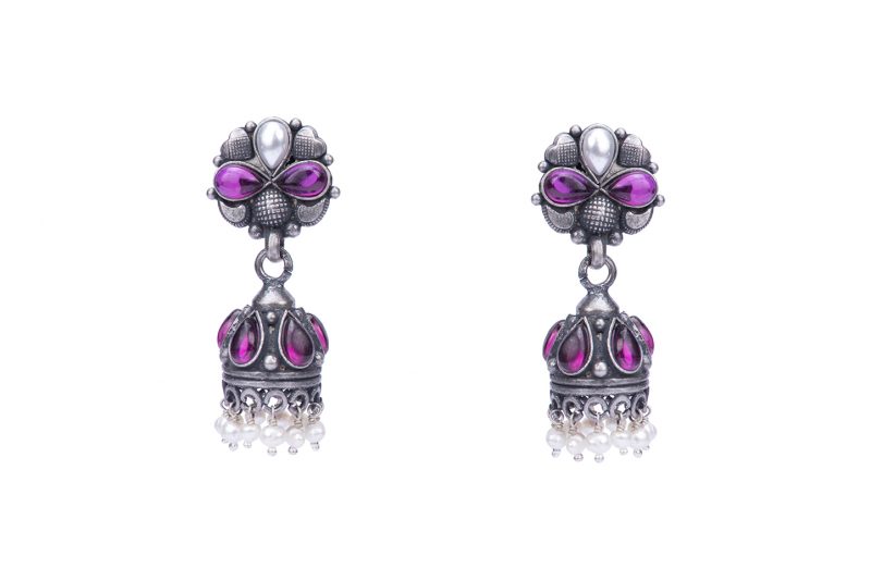 Little Dome Jhumpkis are made in oxidised Silver with Pear shape pearl and glass bead giving flower motifs. These earrings are perfect for everyday formal wear.