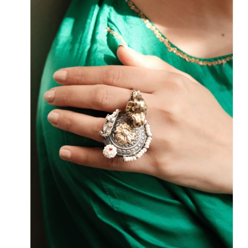 Handcrafted in silver with bird motifs in silver and kundan comes with adjustable free size ring band , this ring is a statement ring for festivities.
